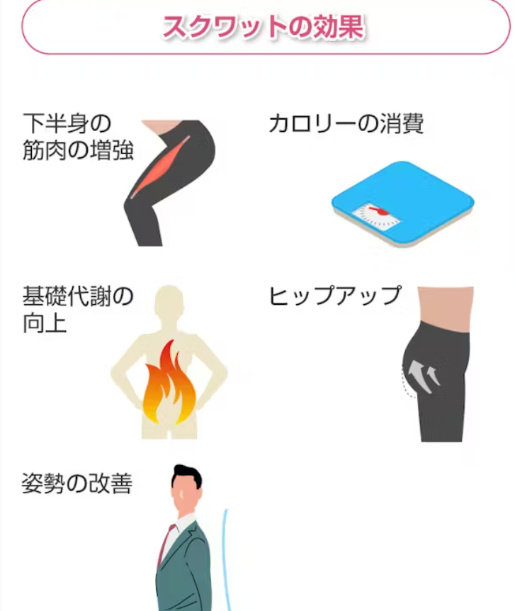 スクワットを行うことにより、下半身・体幹の強化はもちろんの事、基礎代謝アップによるダイエット効果・血流促進による冷え性の予防・体幹の安定による姿勢改善など非常に大きなメリットばかりあります。