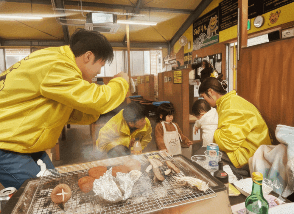 炭火を囲んで牡蠣を焼きながら、焼き加減を見たり、殻むきに挑戦したり🔥