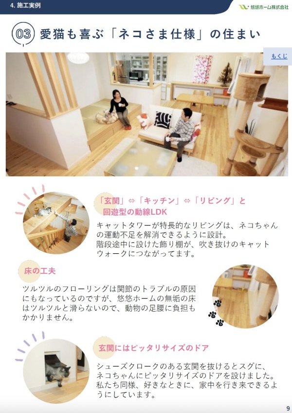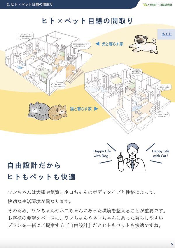 ヒトが暮らしやすいだけでなく、一緒に暮らすワンちゃんやネコちゃんも、のびのびと健康に暮らすことができる、そんな理想のお家をご提案いたします。
