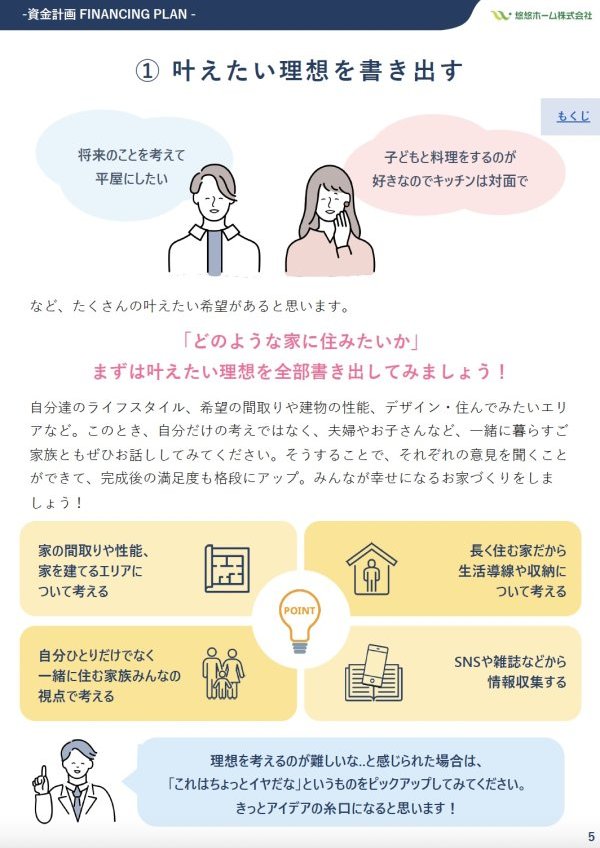 どのようなことに気をつけて資⾦の計画をしていけば良いのか、全体像を掴みやすくするポイントをお伝えしながら、家づくりステップをご紹介いたします。