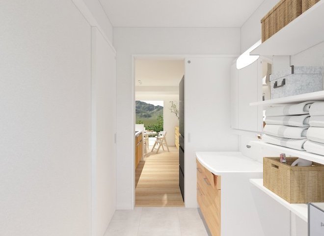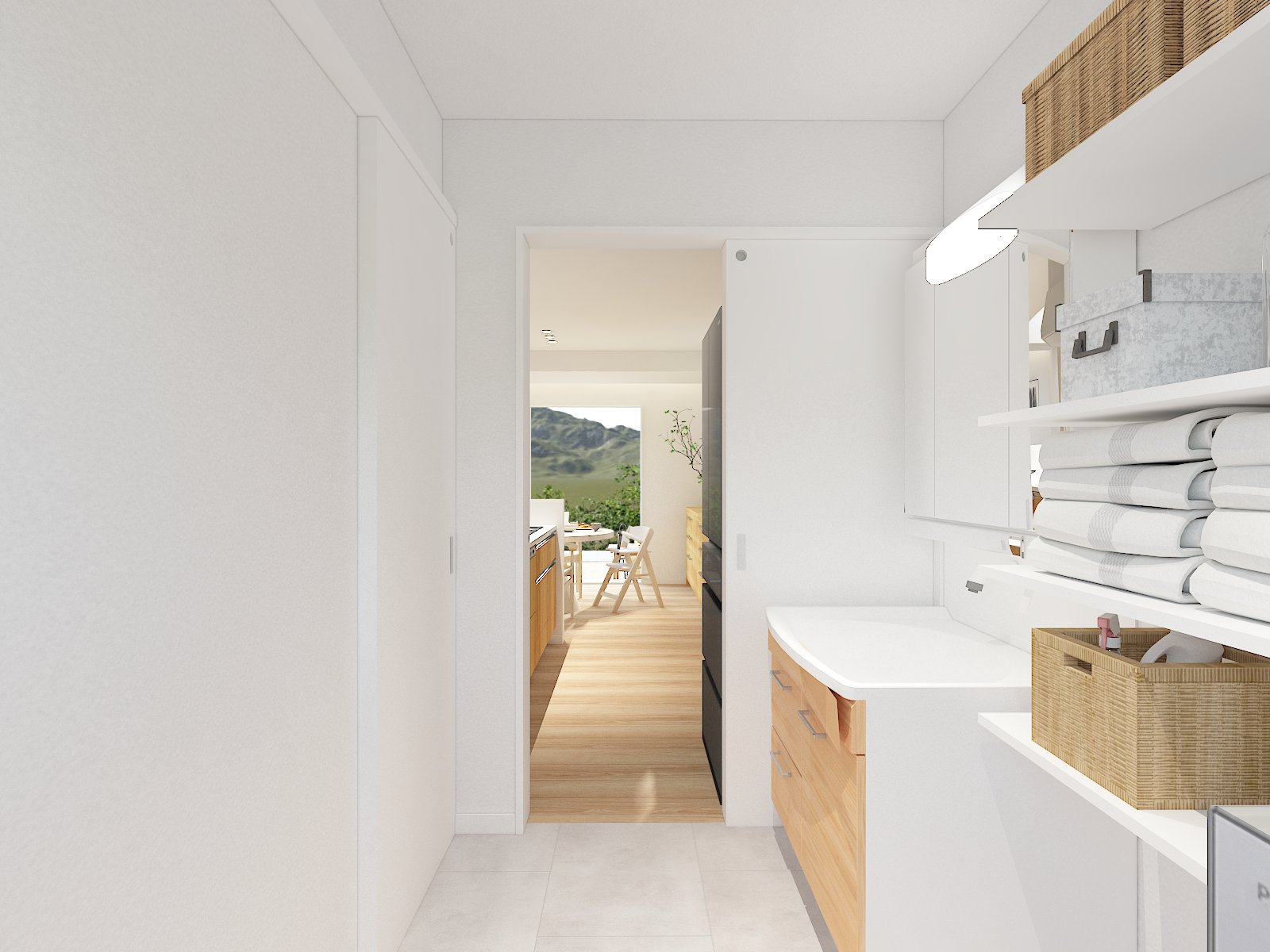 ■家事「楽」動線:キッチン・ダイニング・洗面室がスムーズに繋がる回遊動線を採用。料理、洗濯、配膳の移動距離を短縮し、忙しい毎日にゆとりが生まれます。