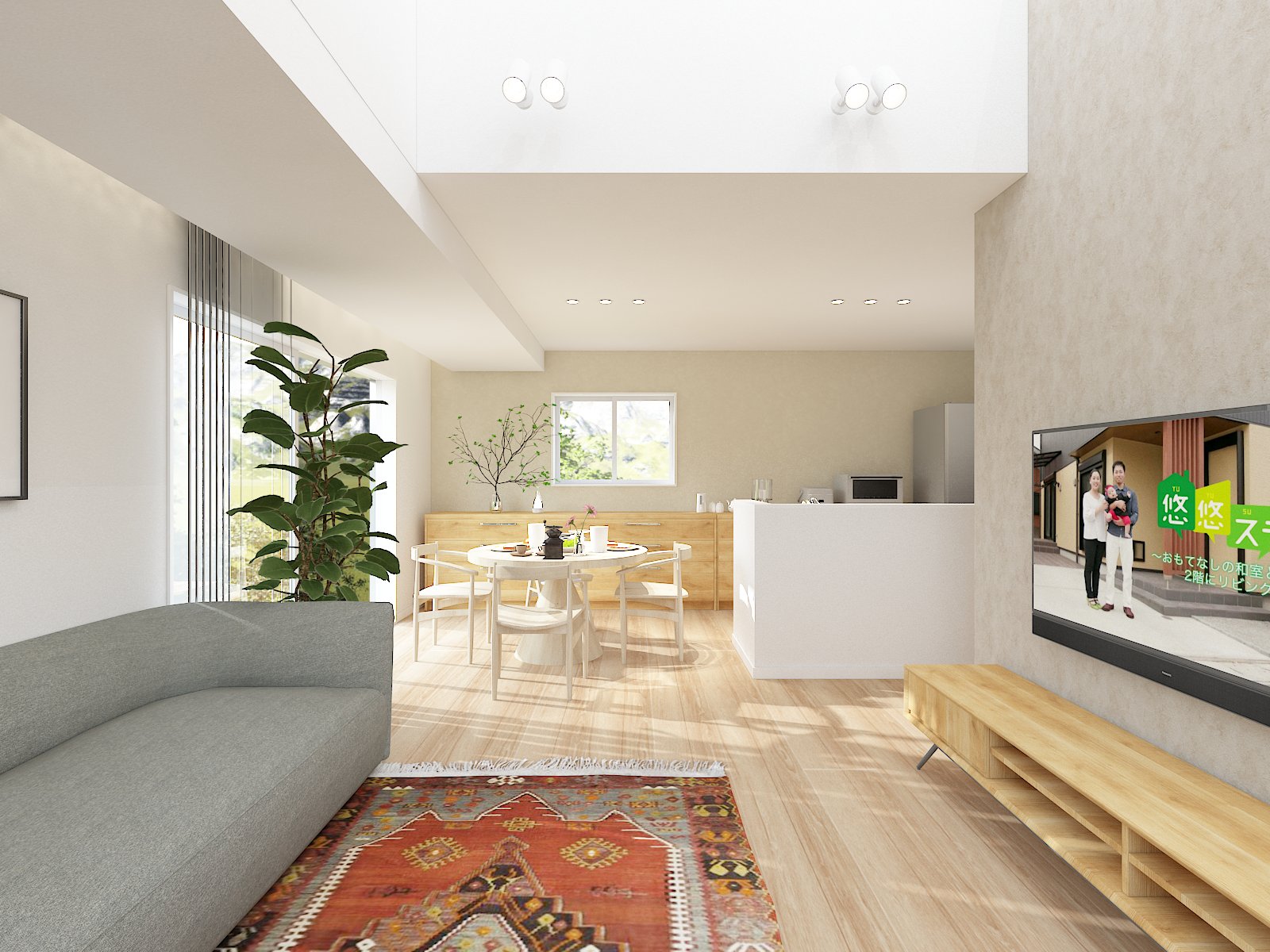 ■開放的なLDK:17.5帖の広さに加え、吹抜けと折上天井が圧倒的な開放感を演出。デザイン性の高い空間で、友人を招きたくなる自慢のマイホームです。