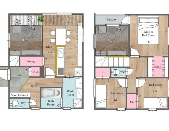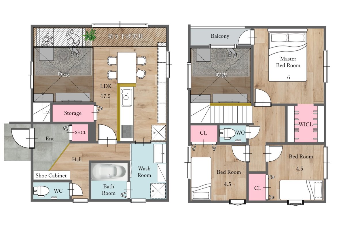 吹抜×折上天井!横並び食堂と洗面直結の家事楽動線。17.5帖の開放的リビング