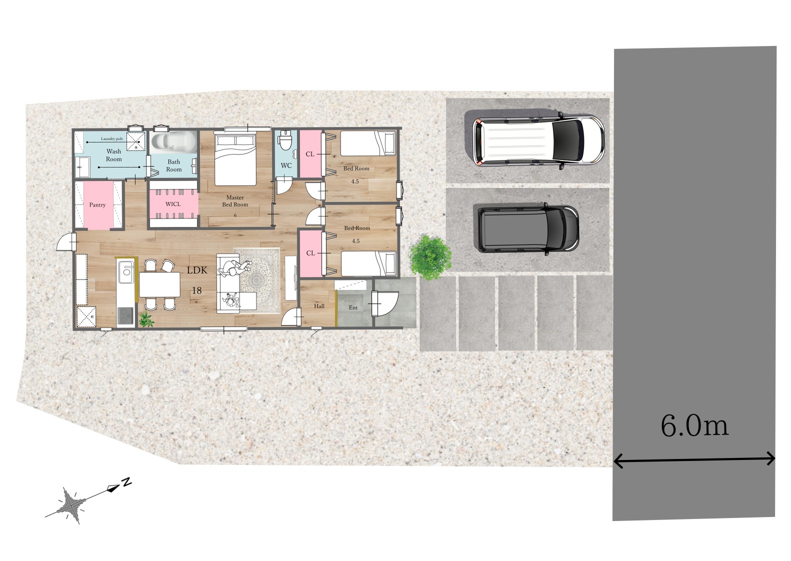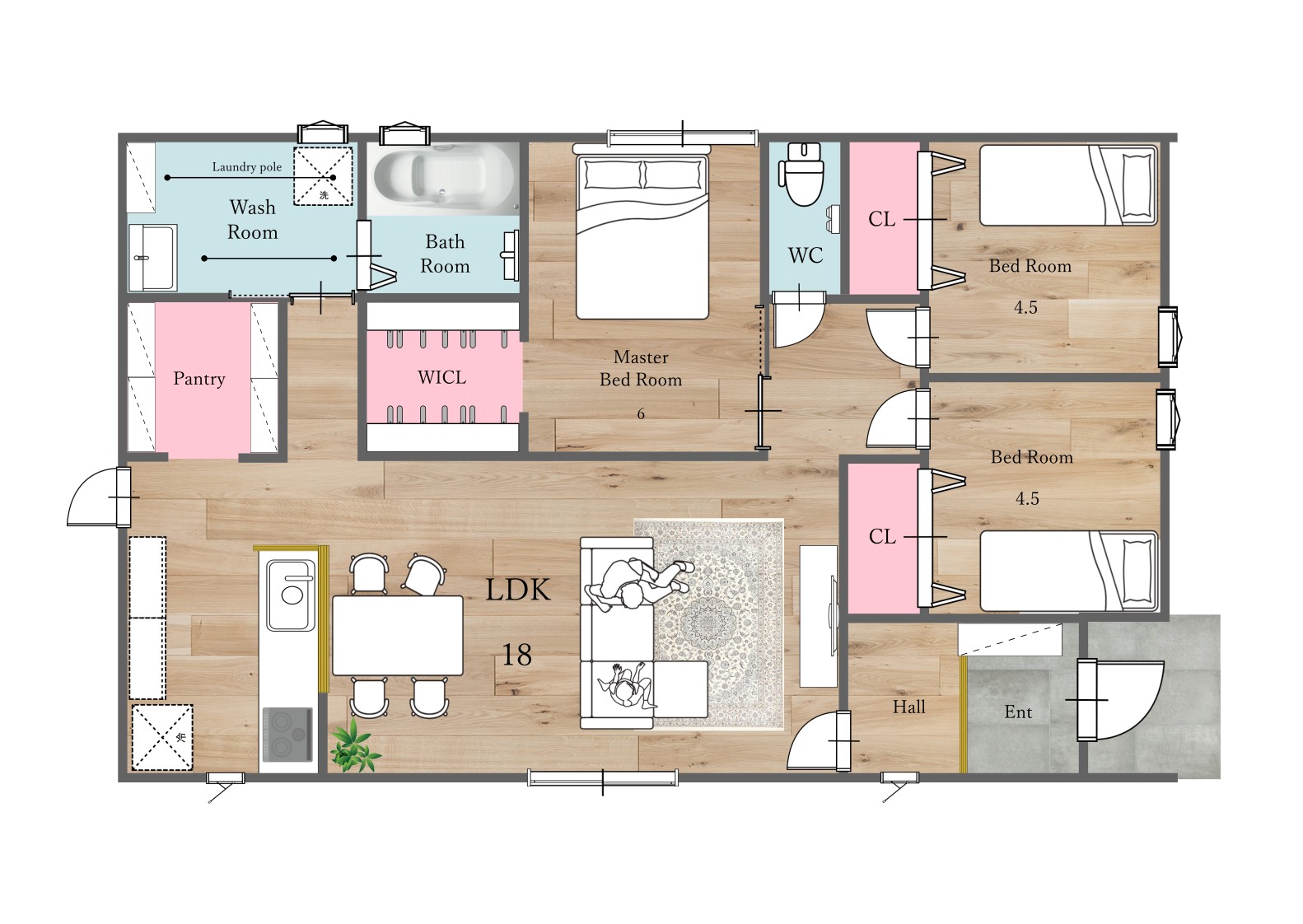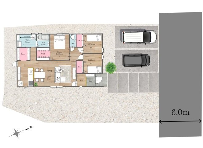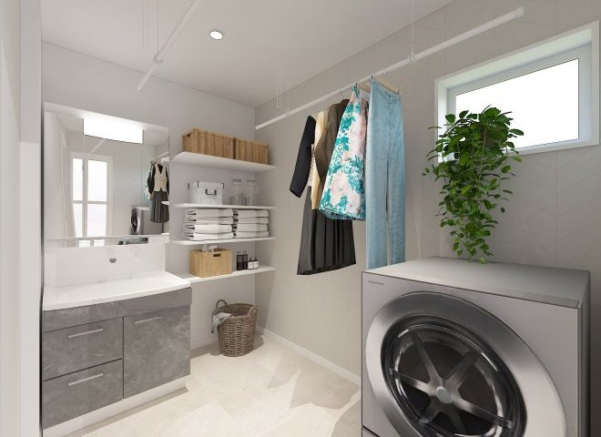太陽光搭載の平屋!パントリーと室内物干しで家事短縮。18帖LDKの開放感を!
