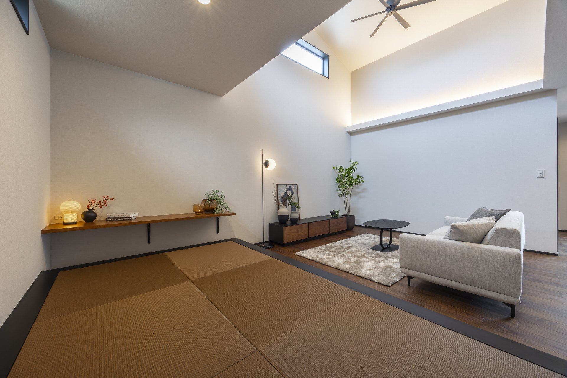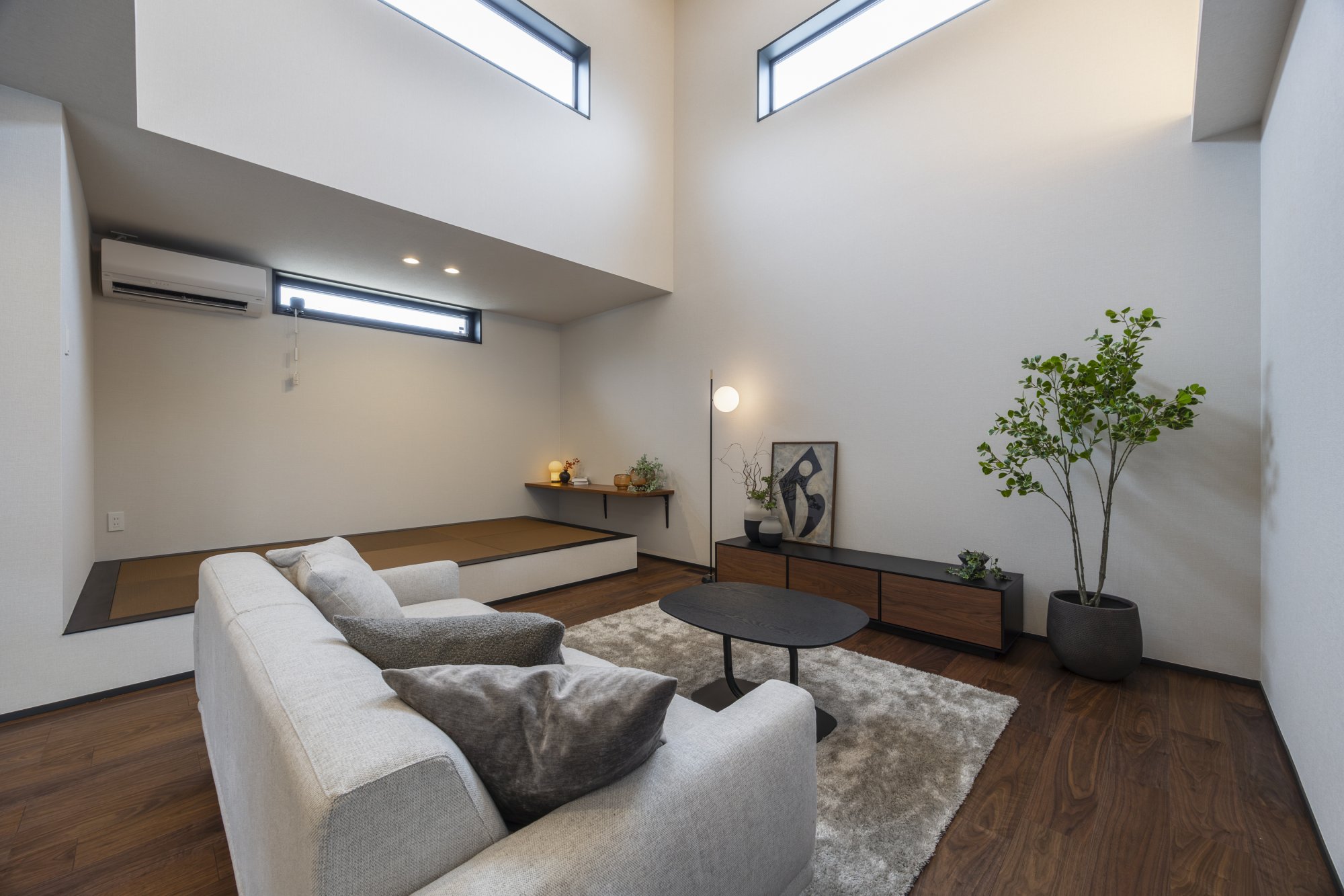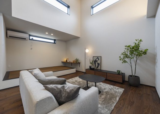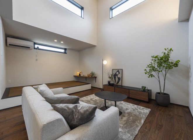 特別な日常:元モデルハウスならではの洗練されたデザイン。勾配天井と高窓がもたらす圧倒的な開放感が魅力です。