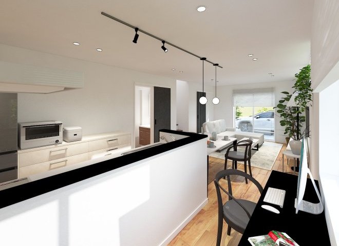 自然と会話が生まれる:キッチン前のカウンターはお子様の学習スペースに最適。料理中も会話が弾みます。