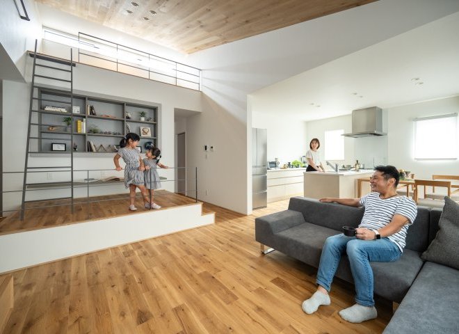 19帖の広々としたLDKは、家族が集まる場所であり、勾配天井がロフトまで続くことで、視界が広がります。