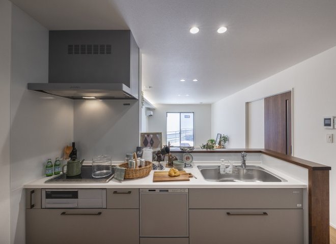 - キッチンはタカラスタンダードを採用。キッチンパネルはホーローなので油汚れに強く、お掃除が楽に!浄水器付内蔵ハンドシャワーは水の無駄使いをカットしてくれます。コンロは2口IHヒーター+ラジエントヒーターの3口。IHなので日々の吹きこぼれお掃除が簡単です♪