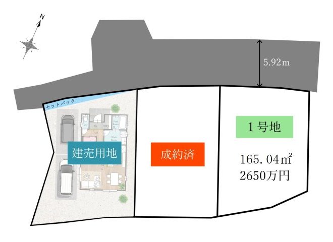 4LDK、土地価格2650万円、土地面積165.04m2、建物価格1960万円(税、外構・付帯工事別)、建物面積97.76m2