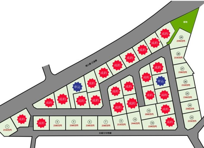 | 土地面積 | 166m2~332m2(50.21坪~100.42坪) | ||