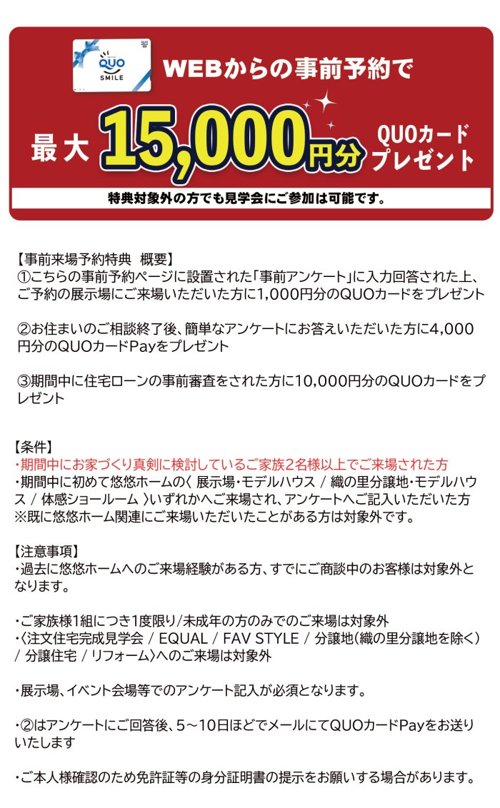 【特典】事前ご来場予約でQUOカード最大15000円分プレゼント!