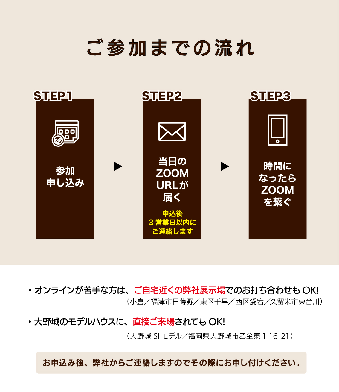 ZOOMでオンライン開催/ご希望があれば弊社展示場か、モデルハウス福岡県大野城市乙金東1丁目16-21でもOK! 《TEL》092-588-1782
