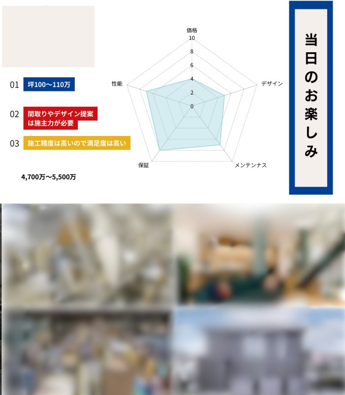 「デザイン」「価格」「性能」「間取り」「保証」などの視点から、わかりやすいグラフで比較・解説!