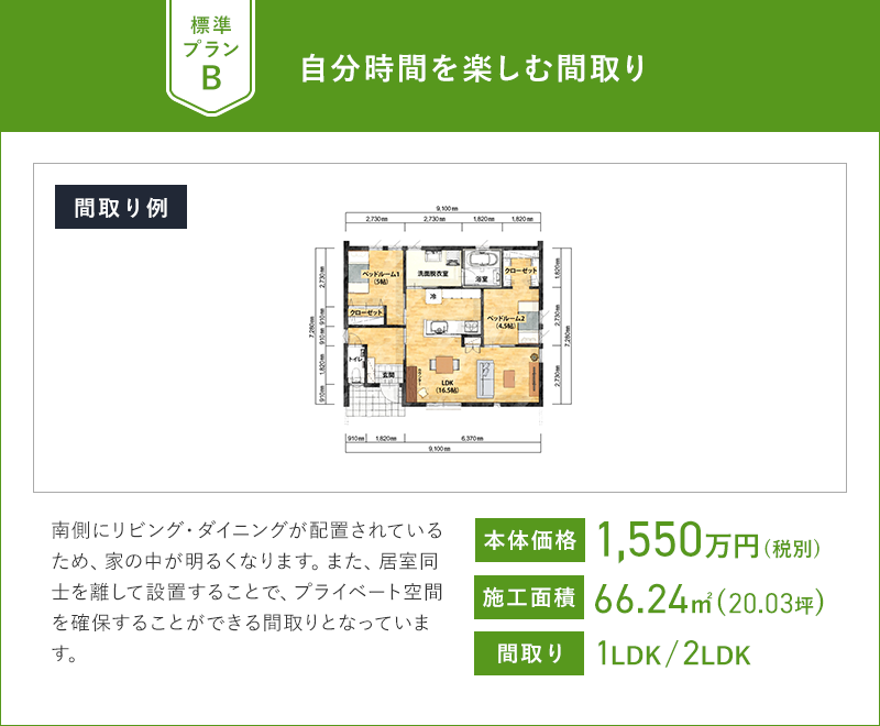 悠悠デュオは、お客さまの理想を叶える二人暮らし専用の住まいです。段差のない平屋住宅で、1LDK・2LDKから選べる空間は夫婦二人がゆったり暮らせる広さです。
