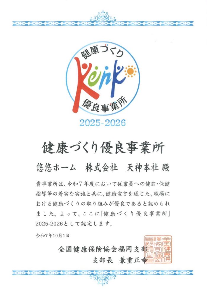 このたび、全国健康保険協会(協会けんぽ)福岡支部より、令和7年度の「健康づくり優良事業所」として認定されましたことをお知らせいたします。