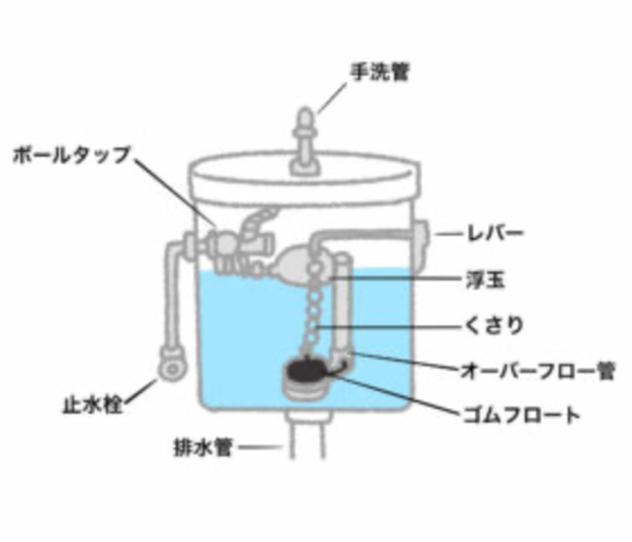 トイレタンク内のゴムフロートが外れている、ゴムフロートに異物が干渉していて正しく閉じなくなっている、浮玉が引っかかって正しく戻らなくなっている、などが考えられます。