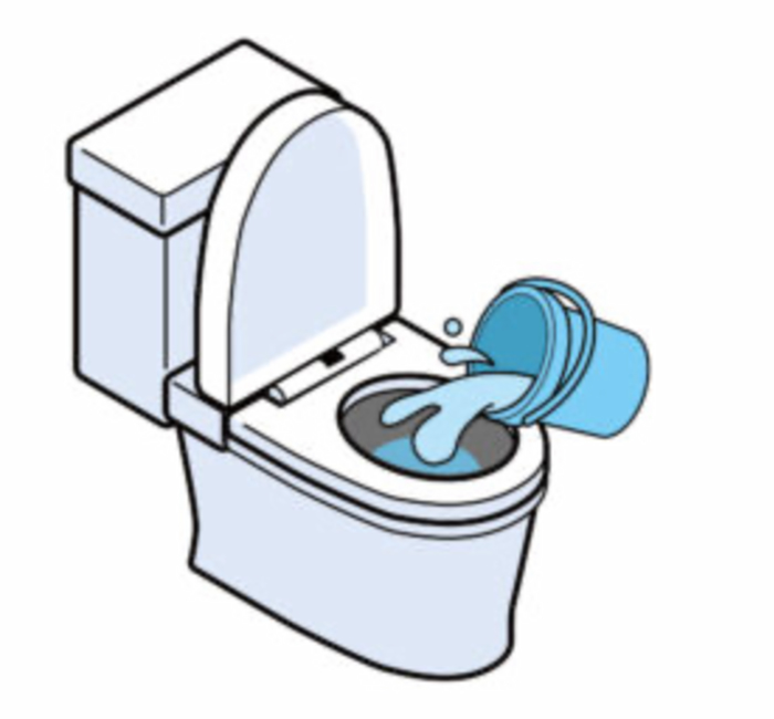 バケツに5,6Lの水を汲み、便器の中央に向かい勢いよく流すことでレバーを引いた際と同じ状況となり排水できます。