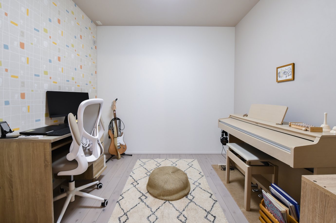 左側はご主人のPCデスク、右側は奥様のピアノを置いて、それぞれの壁に自分好みのクロスをセレクトしている。正面に採用した白いクロスでは、ホームシアターを楽しむ予定だそう。