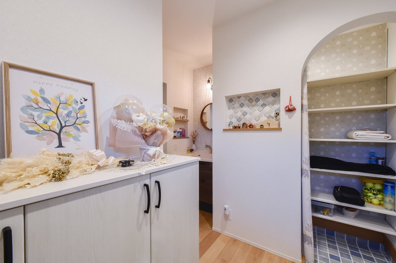 アーチ形の入口が愛らしいシューズクロークは、敢えて扉を設けずカーテンで仕切っている
