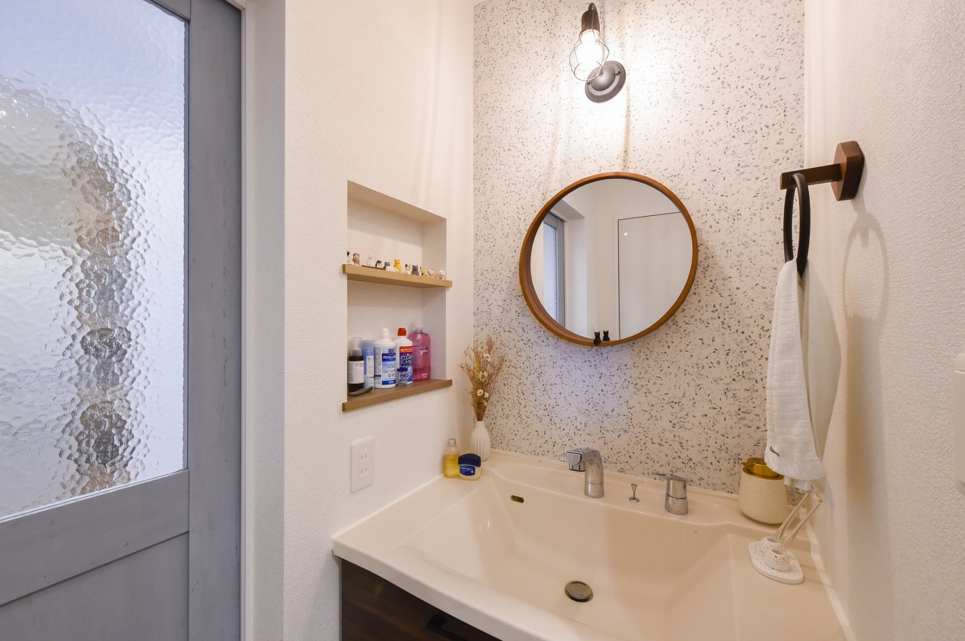 洗面台は、帰宅後の手洗いだけでなく、ゲストが利用する際にも便利な配置。既成の商品にお気に入りの鏡や照明、ニッチを組み合わせることで、造作洗面台のような洒落た仕上がりに!
