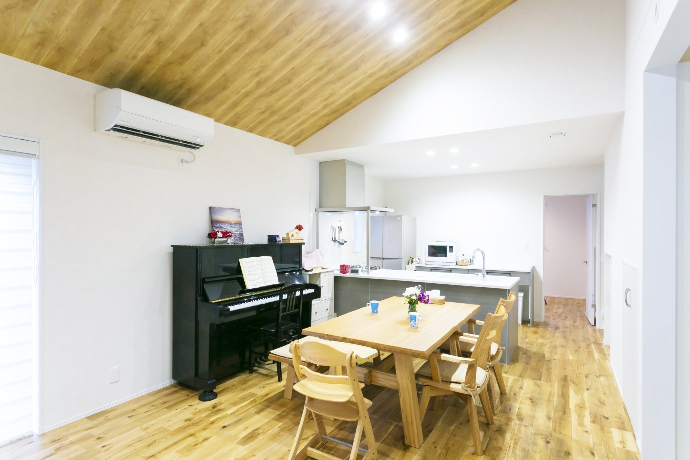 勾配天井による高さを活かした設計で、数字以上の広がりを感じるLDK。一角には妻が以前使っていたピアノを置き、いずれは娘と一緒に音楽を楽しみたいのが夢ですとお話しいただきました。