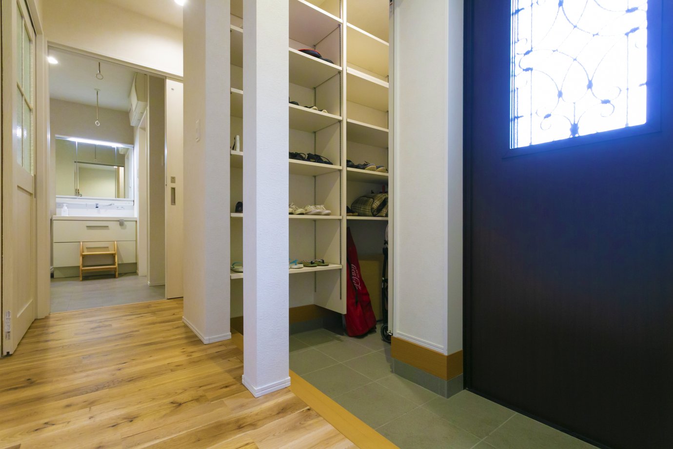 玄関脇には扉付のゆとりあるシューズクローゼットを設置。玄関からそのまま洗面脱衣室へ向かう動線を確保しているから、「帰宅後手洗いを済ませてからリビングへ」が習慣に