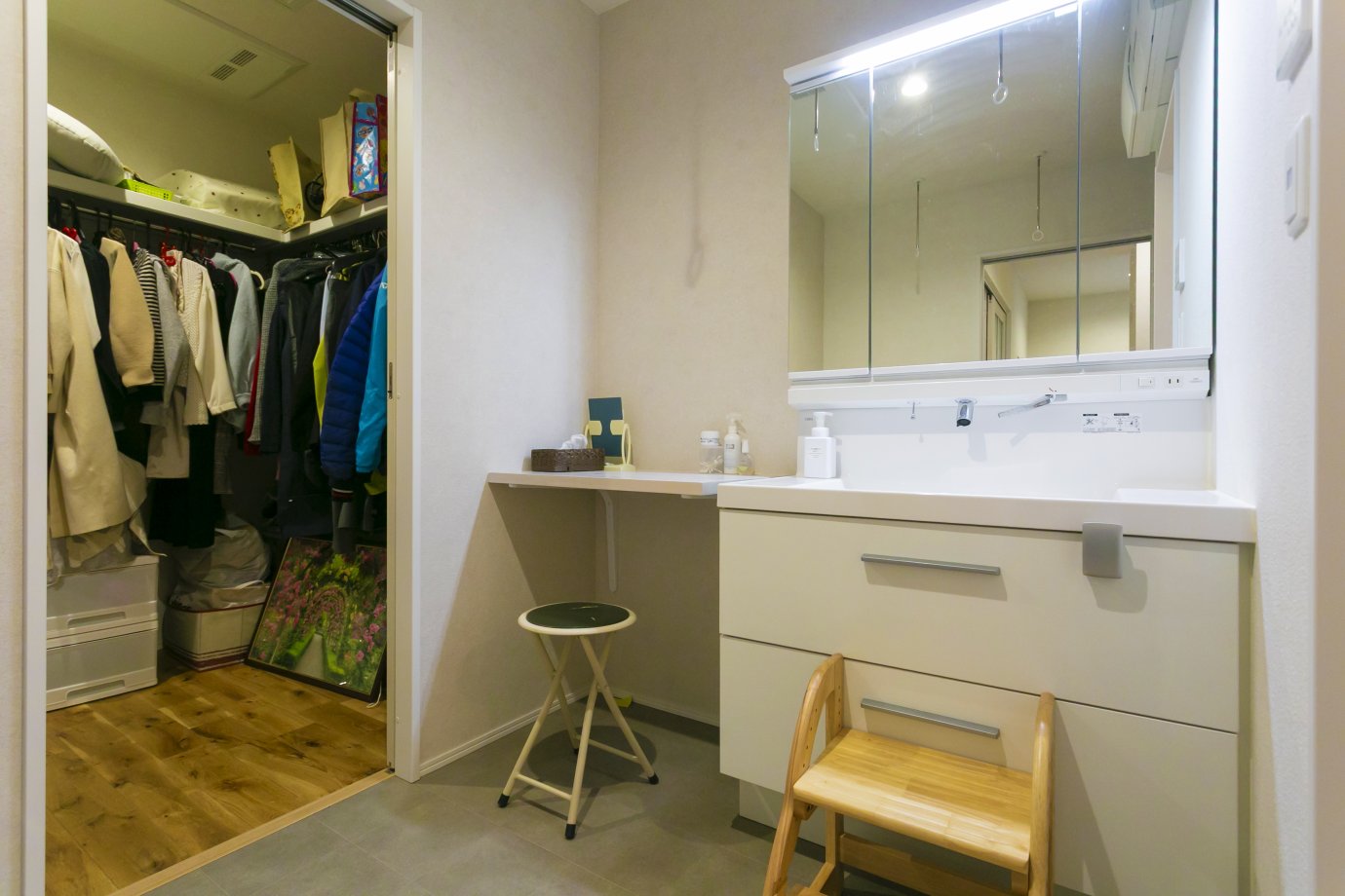 わざわざ居室まで着替えを取りに行かずに済むように、洗面脱衣室とファミリークロークは隣り合わせに配置。洗顔・歯磨き・着替えなど、お出かけの際の身支度は、ここですべて完結できる!