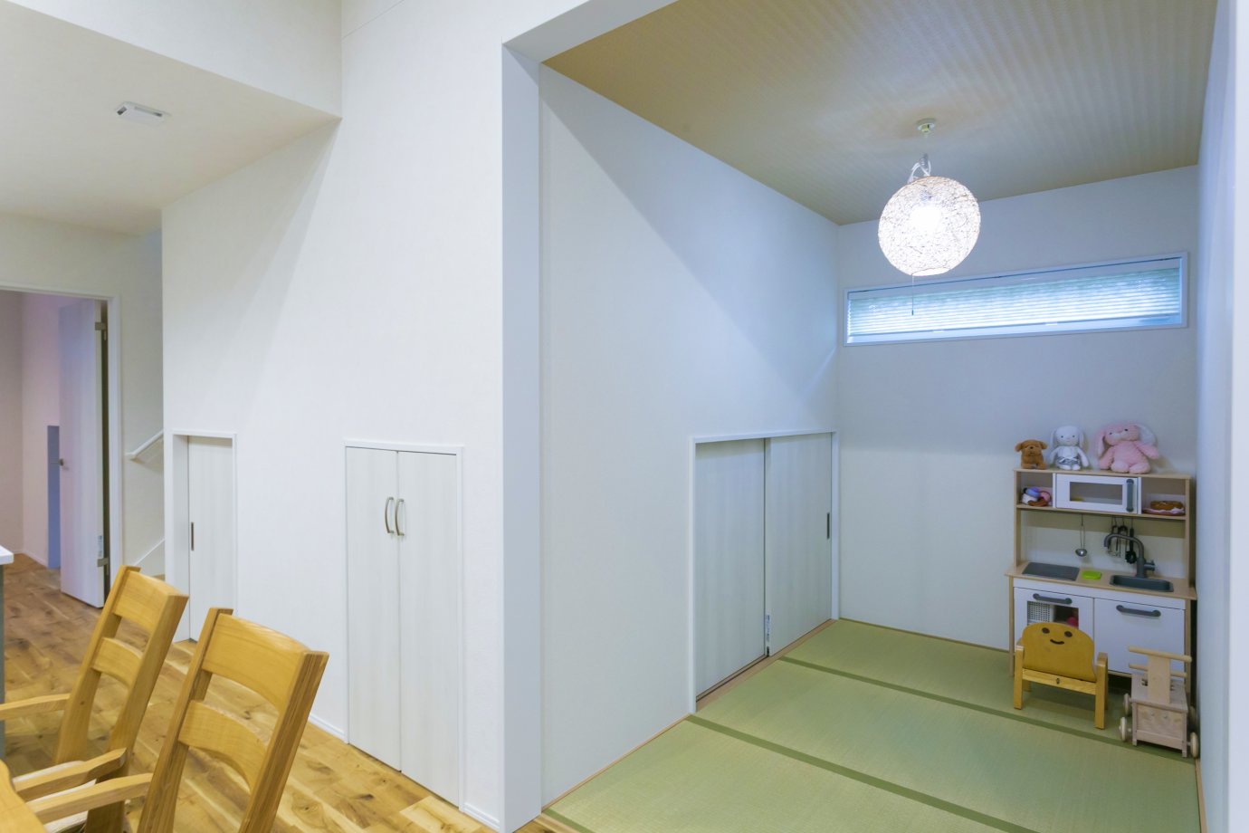 畳スペースは子どもの遊び場やお昼寝の場所として活用。キッチンやダイニングから見守れるので、家事と子育ての両立を図りたいファミリーにオススメの空間◎
