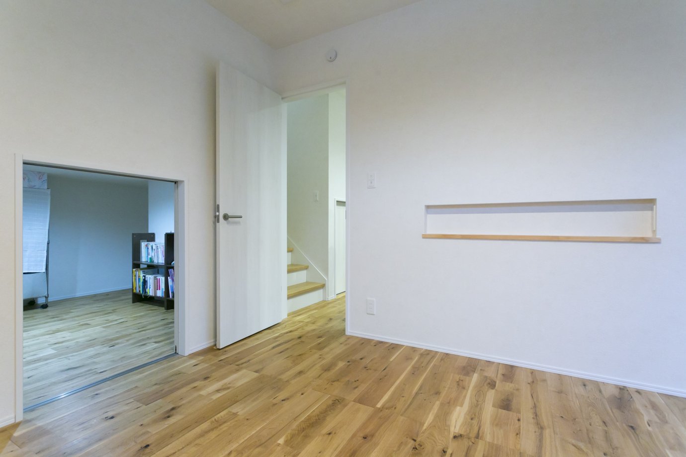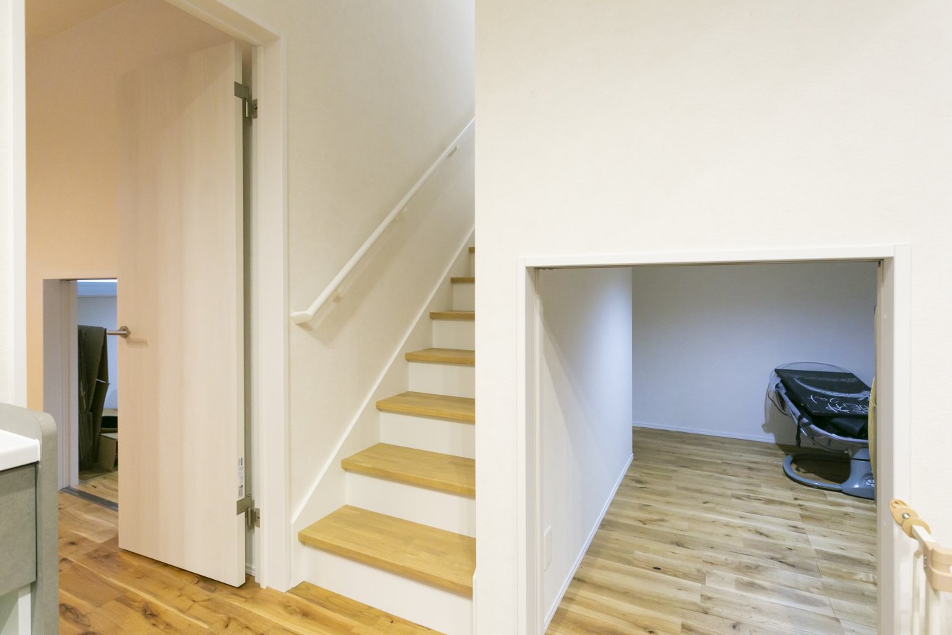 寝室側にも出入口を設けたコの字型の収納。奥をぐるっとまわってダイニング側まで物を入れられる。階段下の壁を挟んで、半分は収納、もう半分は子どもの秘密基地など、様々な使い方ができそう