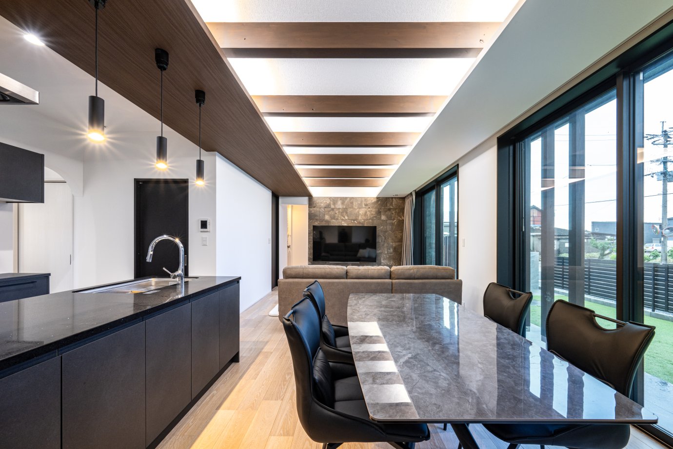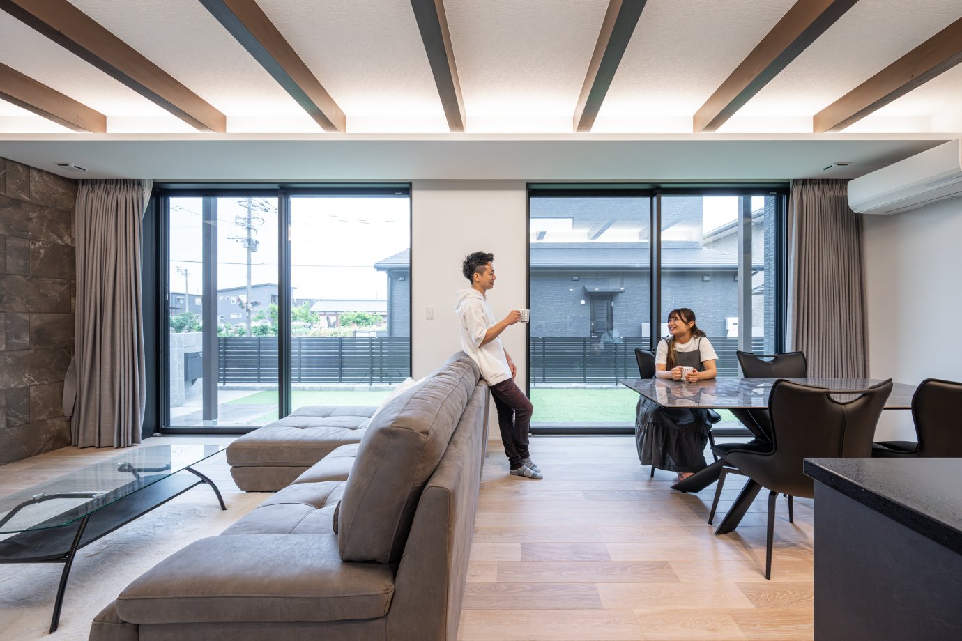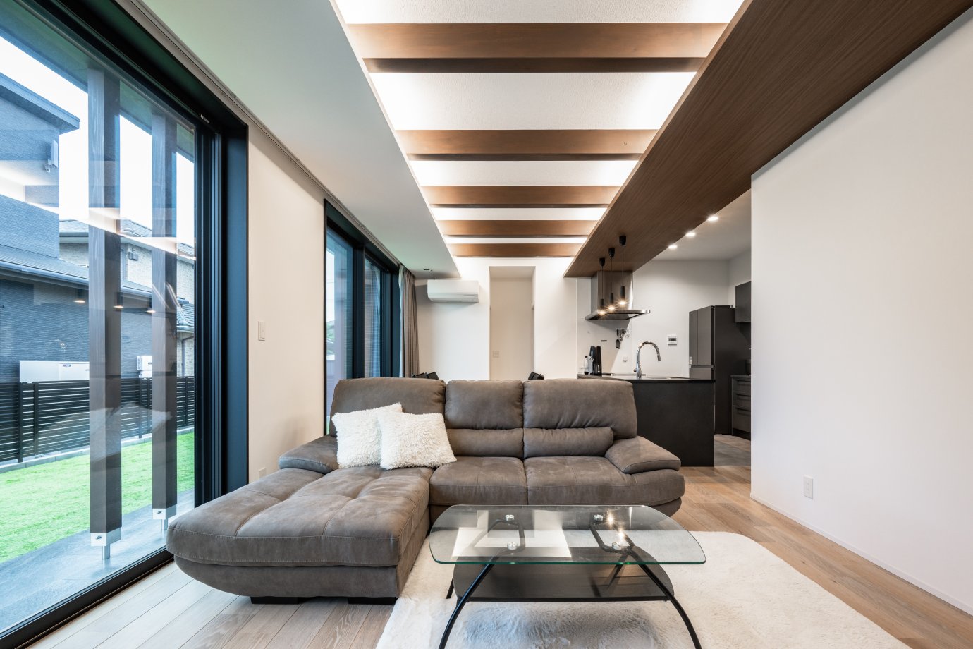 大きな庭に面してLDKを配置。天井にあしらったデザイン梁が奥へ奥へ導くような効果を果たし、視覚的にも広がりを感じさせる間取りに。