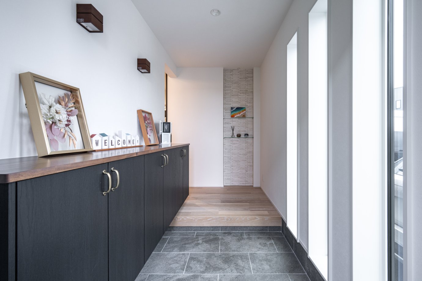 壁側のスリット窓から明るい光がたっぷりと差し込む玄関。正面の壁には調湿・防臭効果の高いエコカラットを採用。