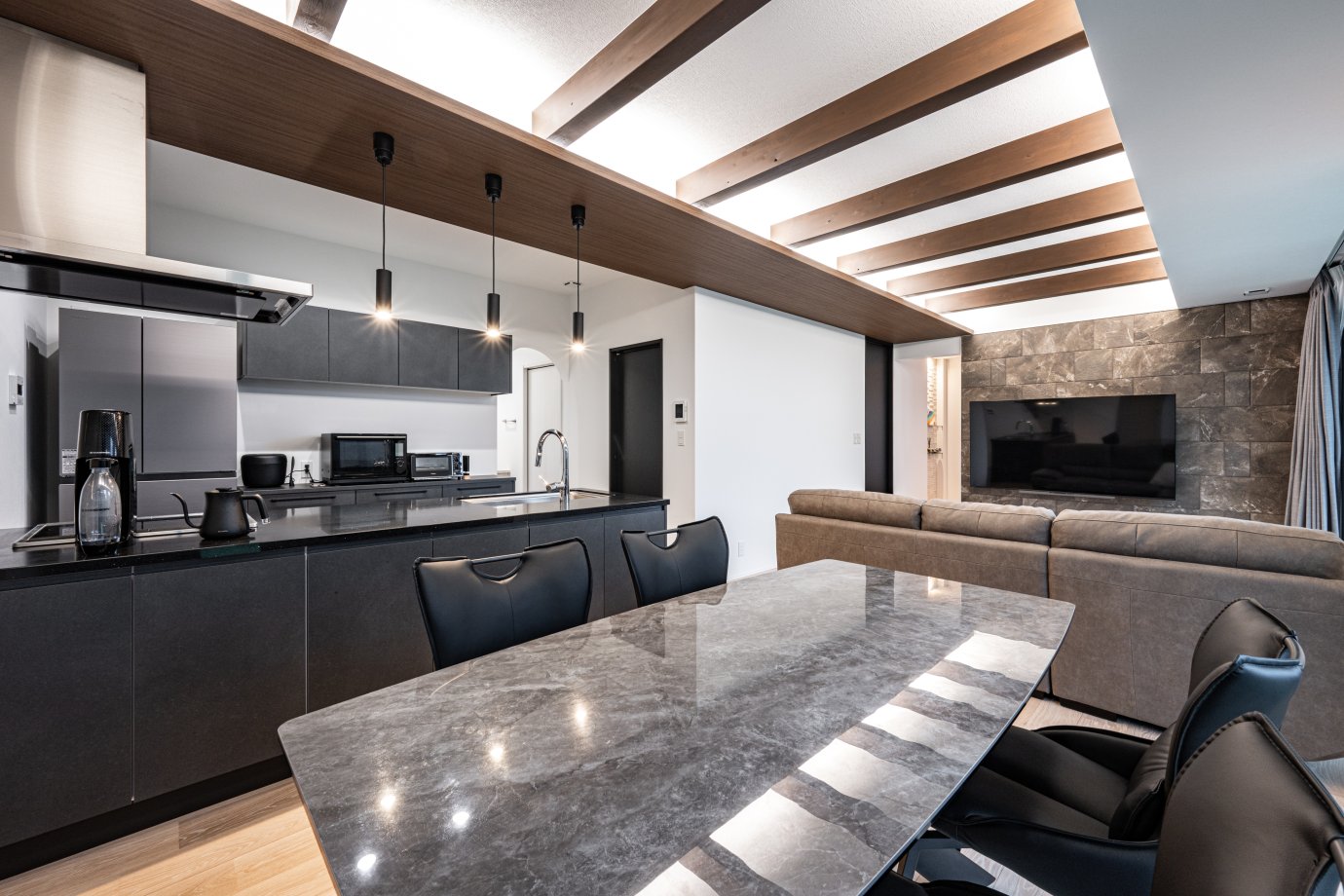 落ち着いた色合いで統一感のある空間に仕上げたLDK。天井の両サイドに間接照明を取り入れることで空間に立体感を生み出し、シンプルなカッコよさを感じさせる空間になりました。