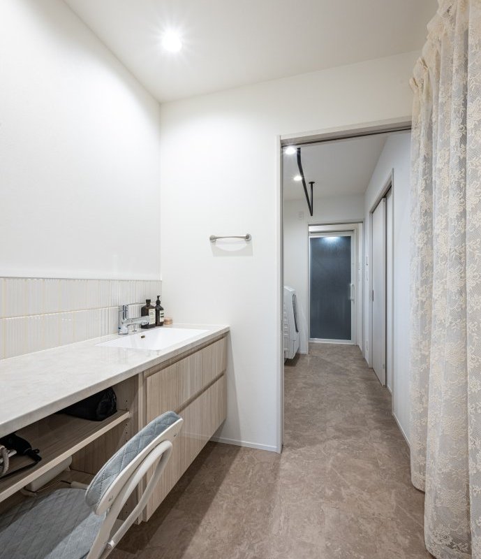 洗面室やランドリー室などの水回りは、リビングと異なるテイストでコーディネート。白を基調にシンプルでありながらあたたかみのある雰囲気に仕上げた洗面台は、SNSで検索しながら、自分好みの色やデザインのイメージを伝えたもの。壁には化粧品などを置ける扉付きのニッチを設けました。