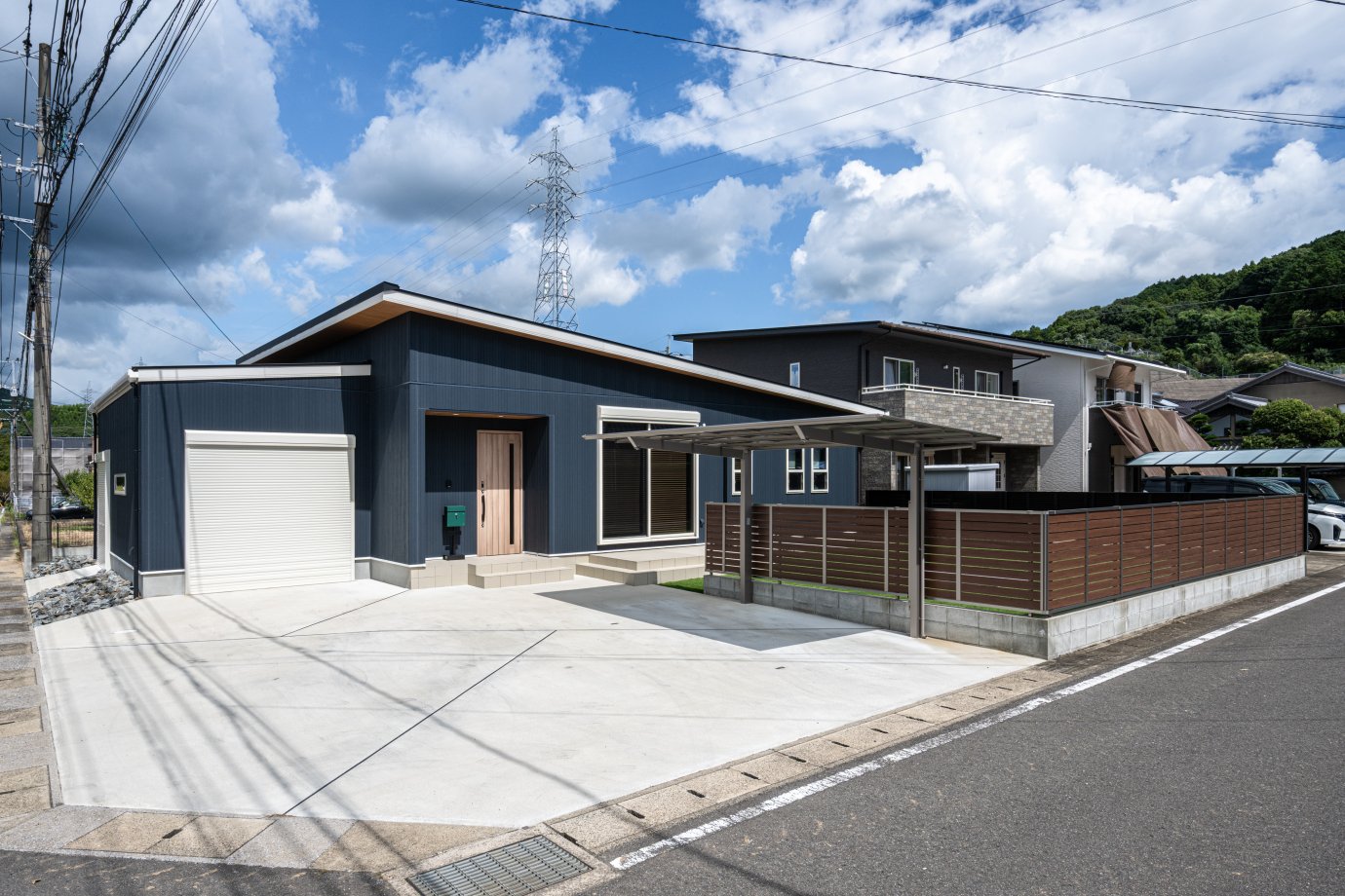 完成したのは、正面とサイドにシャッターを設けた、愛車とバイクを大切に保管できるビルトインガレージの平屋です。