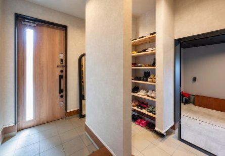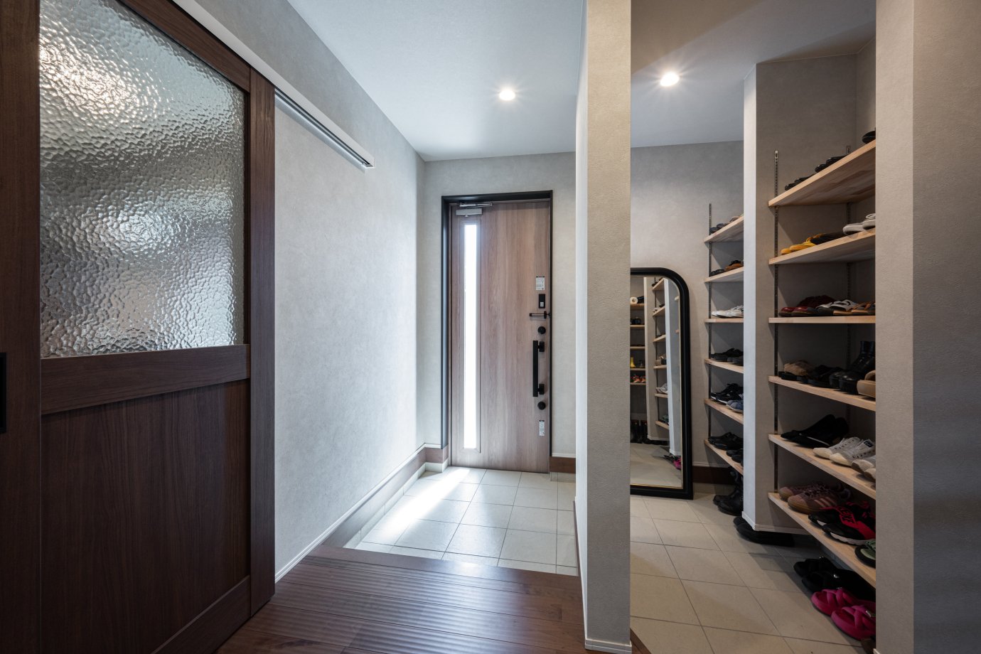 玄関には、ロングブーツや傘なども自在に収納できる、可動棚付きの大容量シューズクローゼットを設置。