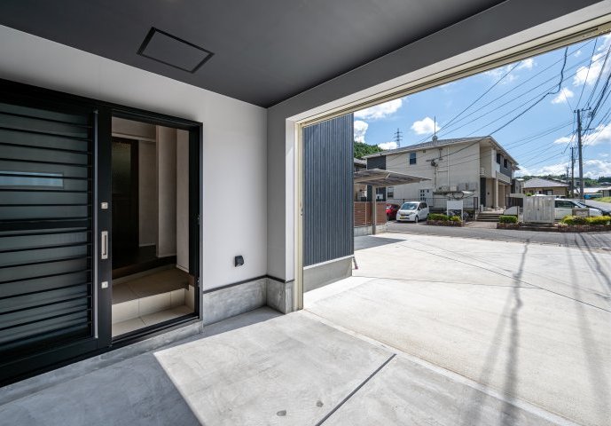 室内と屋外への2Way動線を確保したビルトインガレージ。雨の日でも濡れずに快適に行き来でき、大切な愛車やバイクを風雨や埃から守ってくれます。