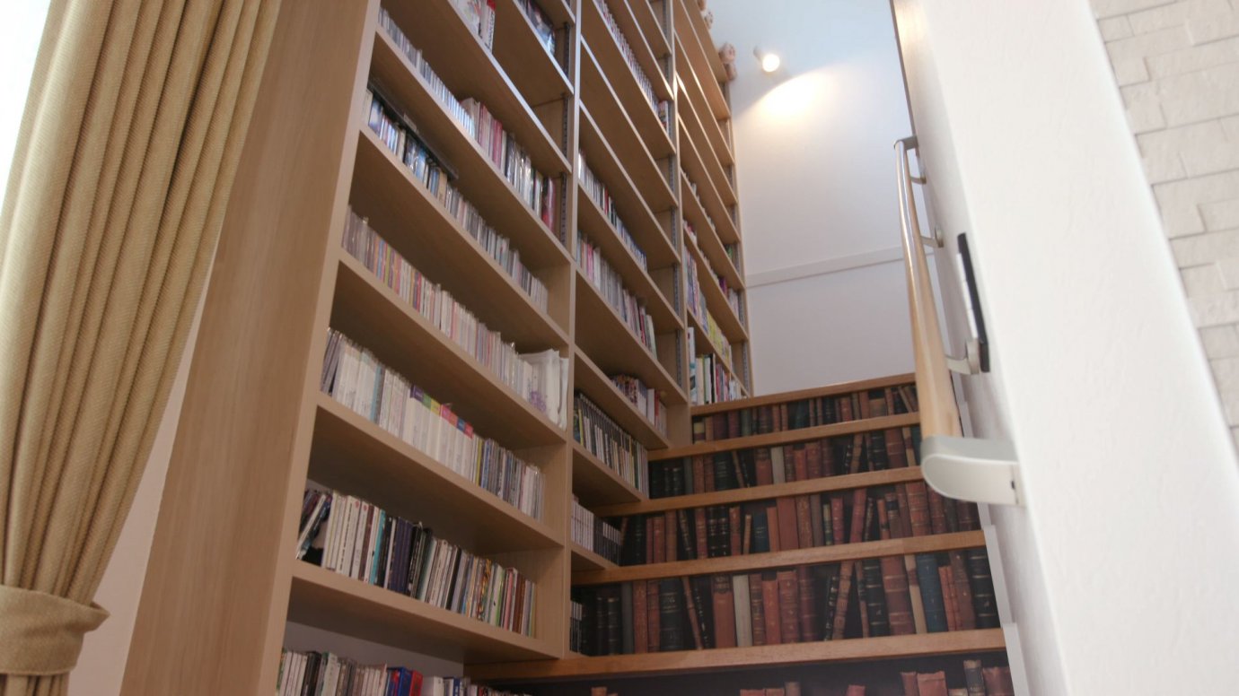 階段に本棚風のクロスを貼り、まるで図書館のようです。