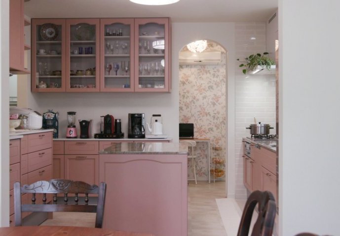 ヨーロピアンなLDK。ピンク色のキッチンが印象的です。