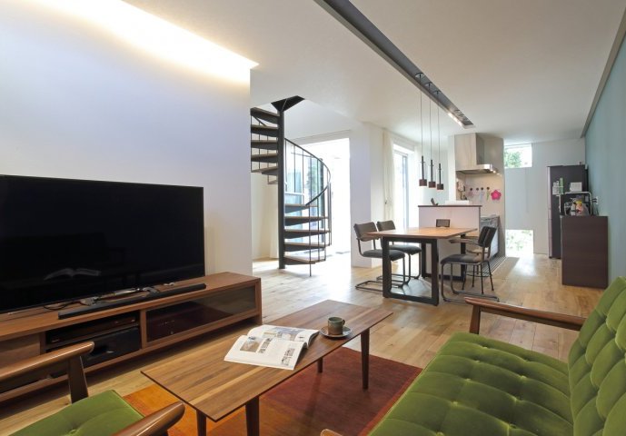階段を螺旋階段にしたことで空間に余裕ができたLDK。お子様と走り回れるようにと、キッチンを中心とした回遊型の動線に。