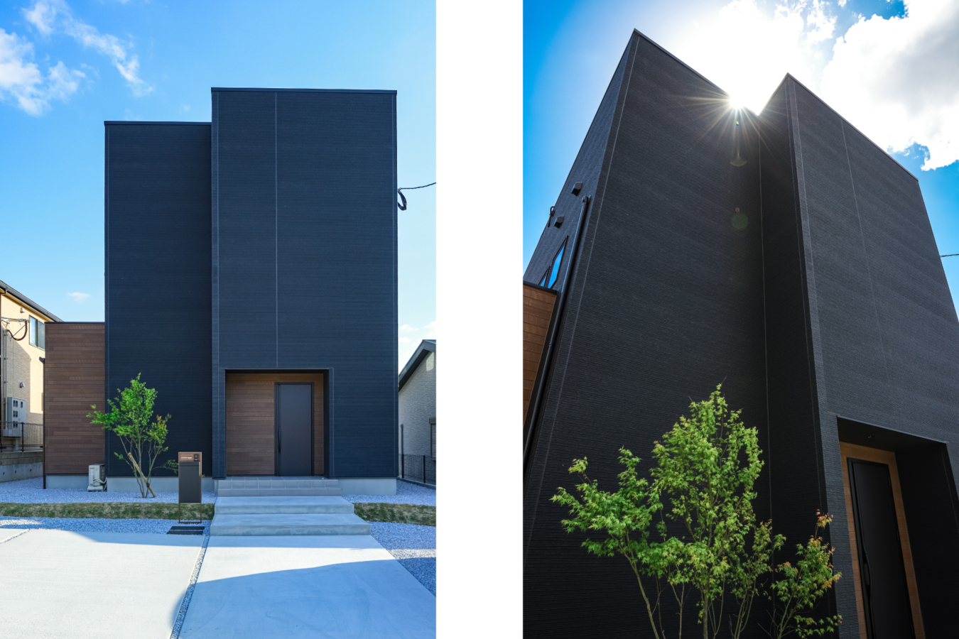 近くに山を望む立地のS様邸の外観は黒を基調にしたとってもアーバンなファザード。北玄関なので表の開口部は玄関のみ。この思い切りの良さがご主人憧れの“かっこいい外観”につながったようです。