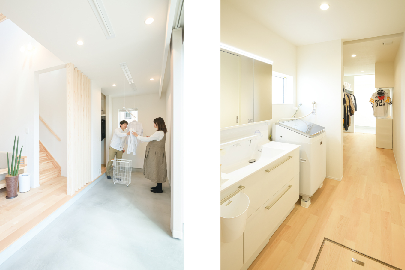 「ここがとっても便利なんです!こちらへどうぞ」と奥様に案内され、キッチン奥のドアから入るとそこは、ランドリースペース~ウォークインクローゼット~土間へと続く動線。