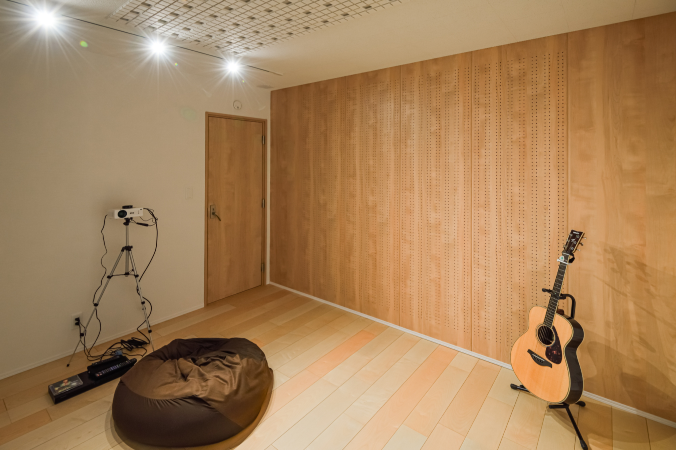 2階には防音壁を施したシアタールーム。「壁一面をスクリーンにして好きな映画やLIVE映像を楽しんでます」とご主人。奥様もこの部屋で趣味のギターを奏でられるそう。
