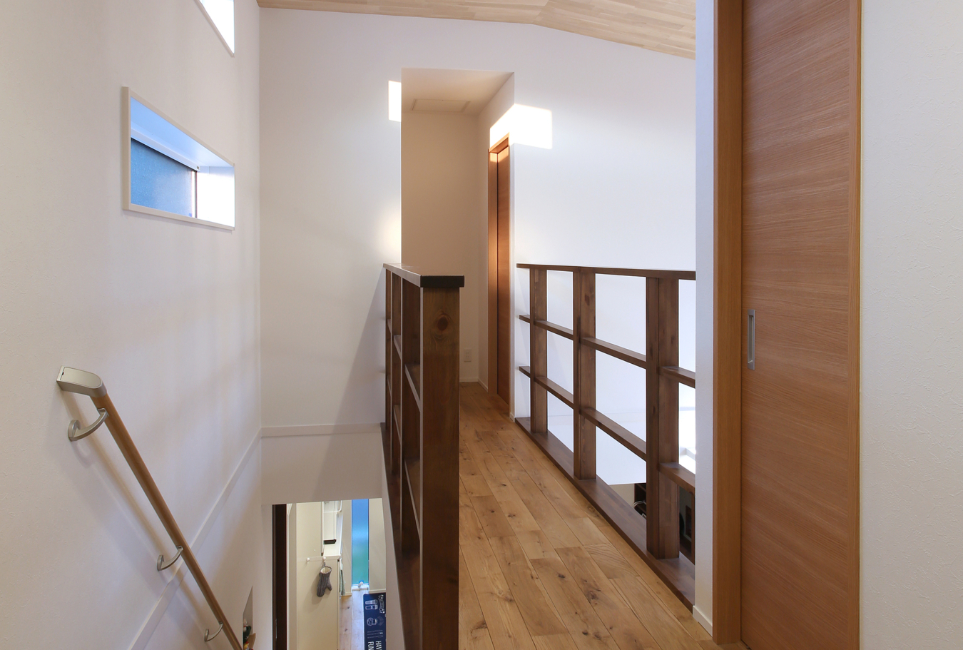 廊下の壁を木の手摺にしたことで、縦の空間も広がりました。