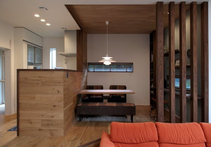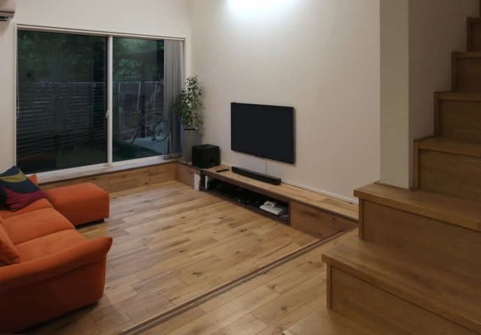 壁ではなくリビングの床を下げて空間を仕切ることで、開放感のあるLDKになりました。