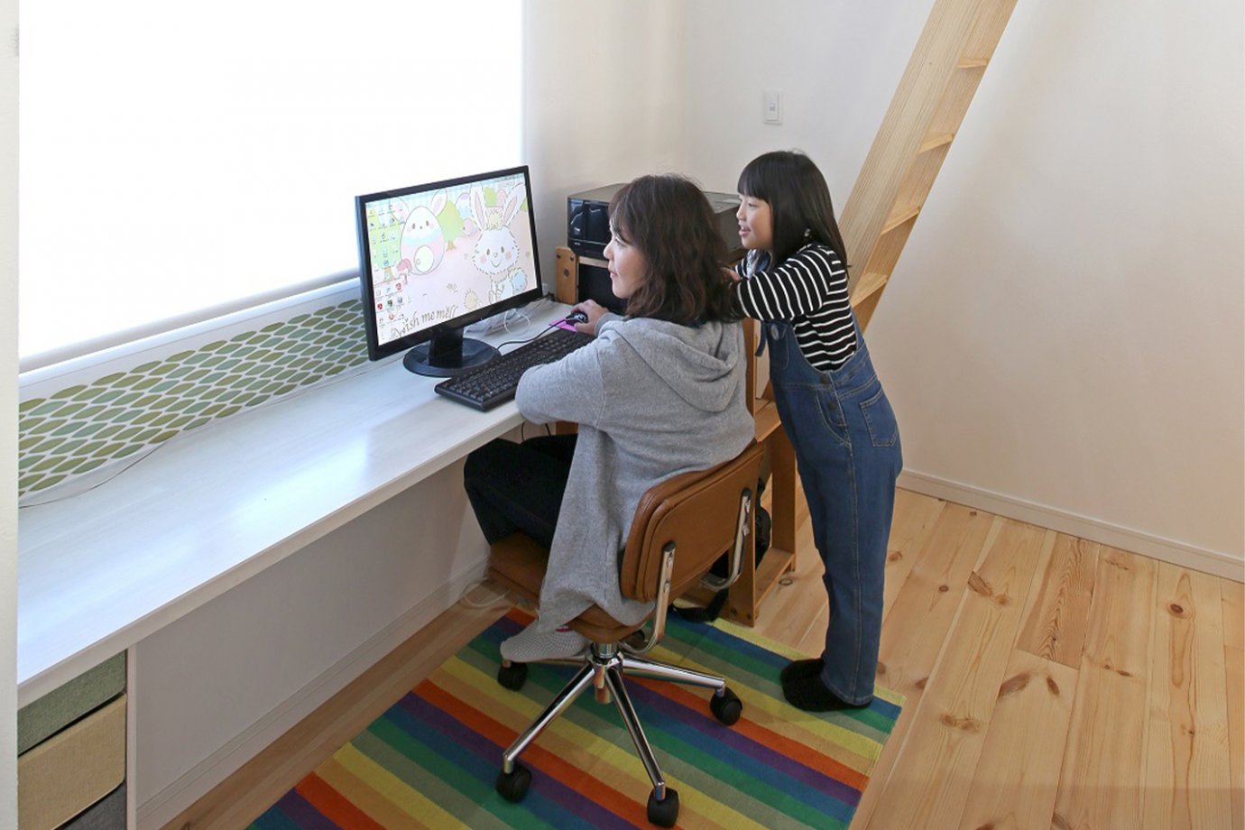 階段を上がったホールにはワークスペースを設置。 家族共有のパソコンを置いて、みんなで使います。