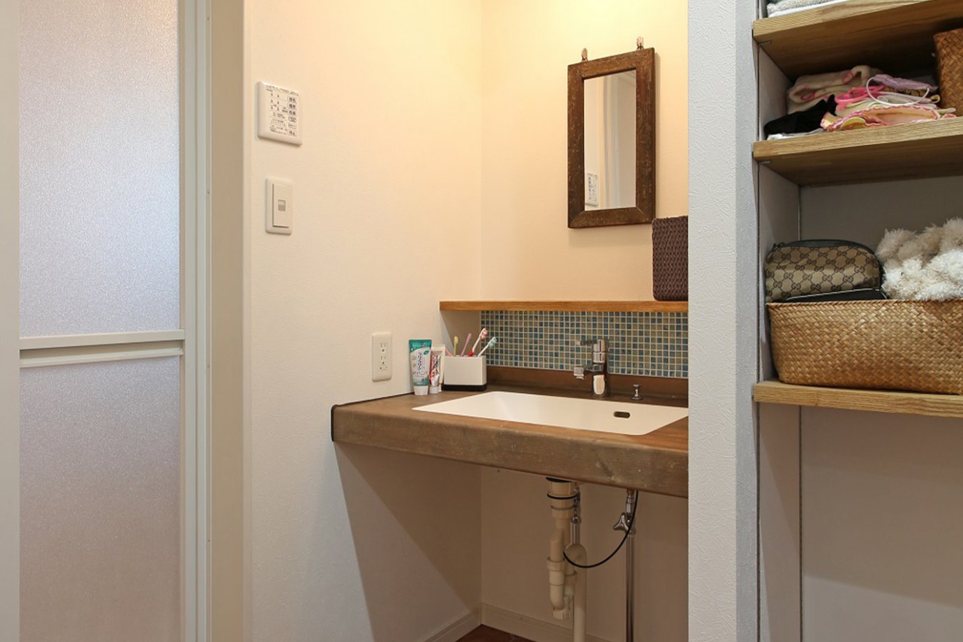 木の天板に埋込式の洗面ボウル。タイル貼り。そして床材まで、 キッチンとイメージを合わせることで、家全体の統一感も出ています。