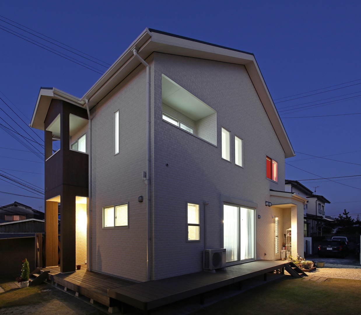 夜の外観はまたちょっとイメージが変わります。 左側の玄関ポーチからぐるりとリビングの裏側までウッドデッキがつながってます。 スタイリッシュな縁側みたいですね。