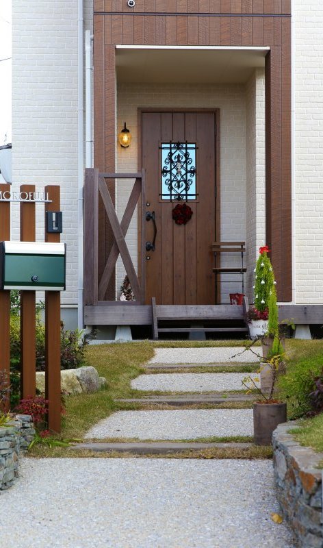 アプローチの小道はコンクリート洗い出しの間に枕木を入れることで、柔らかく温もりのある印象に。芝生もあるから、ワンちゃんの足が汚れない工夫もバッチリです!外観のダークブラウンと、壁掛けのポストの深い色合いがオシャレですね。