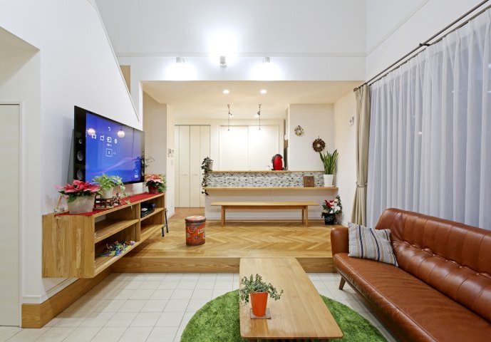 ヘリンボーン貼りのフローリング、白いタイルの土間、小上がりの畳と、機能性を考えつつ、見た目の変化も楽しめます。テレビボードは造作で壁面に設置。