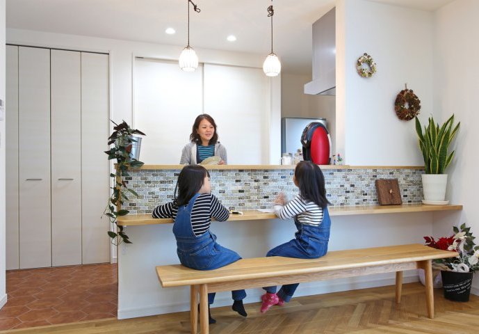 モザイクタイルをあしらった造作カウンターに、 家事をしながらでも子ども達に目が行き届く家族想いのキッチン。